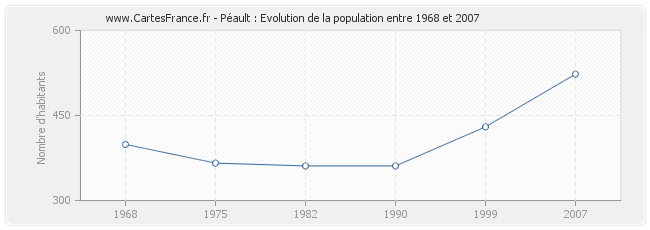 Cette courbe reprend l'historique de la population de Péault de 1968 à 2007 en interpolation cubique. Ceci permet d'obtenir plus précisément la population de la commune de Péault les années ou aucun recensement n'a été effectué.