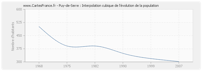Cette courbe reprend l'historique de la population de Puy-de-Serre de 1968 à 2007 en interpolation cubique. Ceci permet d'obtenir plus précisément la population de la commune de Puy-de-Serre les années ou aucun recensement n'a été effectué.