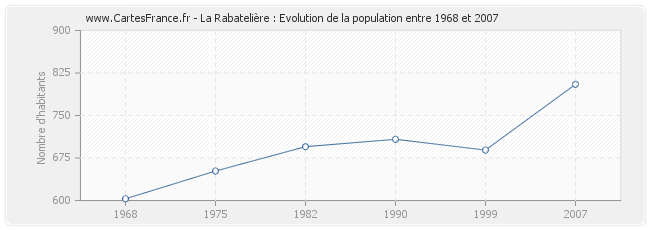 La population de La Rabatelière était de 805 habitants en 2007, 689 habitants en 1999, 708 habitants en 1990, 695 habitants en 1982, 652 habitants en 1975 et 603 habitants en 1968.