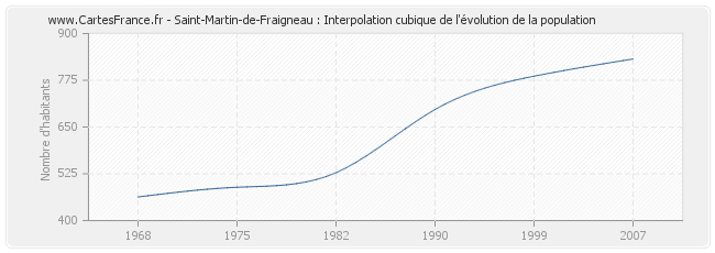 Cette courbe reprend l'historique de la population de Saint-Martin-de-Fraigneau de 1968 à 2007 en interpolation cubique. Ceci permet d'obtenir plus précisément la population de la commune de Saint-Martin-de-Fraigneau les années ou aucun recensement n'a été effectué.