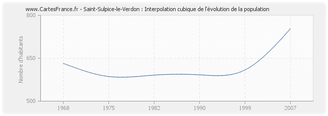 Cette courbe reprend l'historique de la population de Saint-Sulpice-le-Verdon de 1968 à 2007 en interpolation cubique. Ceci permet d'obtenir plus précisément la population de la commune de Saint-Sulpice-le-Verdon les années ou aucun recensement n'a été effectué.