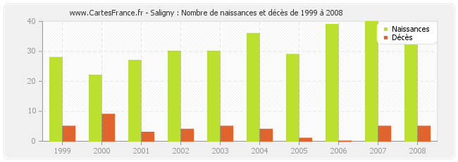 Saligny : évolution des naissances et décès de 1968 à 2007
