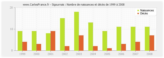 - Sigournais en 2008 : 11 naissances et 7 décès