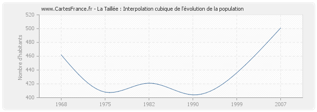 Cette courbe reprend l'historique de la population de La Taillée de 1968 à 2007 en interpolation cubique. Ceci permet d'obtenir plus précisément la population de la commune de La Taillée les années ou aucun recensement n'a été effectué.