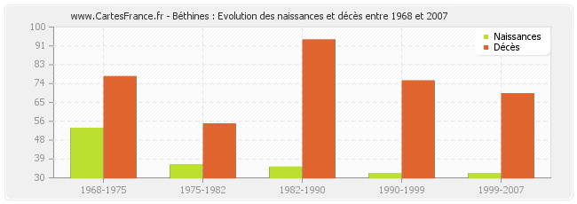 Béthines : évolution des naissances et décès de 1968 à 2007