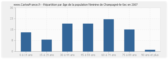 Répartition de la population féminine de Champagné-le-Sec par âge en 2007 :