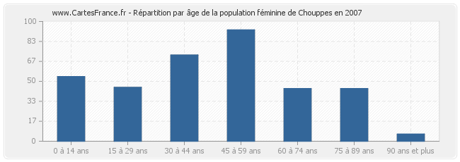 Répartition de la population féminine de Chouppes par âge en 2007 :