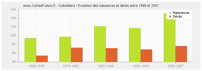 Colombiers : évolution des naissances et décès de 1968 à 2007