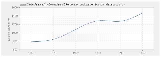 Cette courbe reprend l'historique de la population de Colombiers de 1968 à 2007 en interpolation cubique. Ceci permet d'obtenir plus précisément la population de la commune de Colombiers les années ou aucun recensement n'a été effectué.