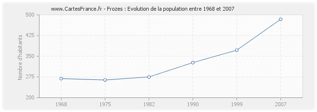 Cette courbe reprend l'historique de la population de Frozes de 1968 à 2007 en interpolation cubique. Ceci permet d'obtenir plus précisément la population de la commune de Frozes les années ou aucun recensement n'a été effectué.