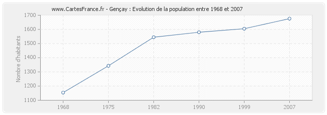 La population de Gençay était de 1 676 habitants en 2007, 1 605 habitants en 1999, 1 580 habitants en 1990, 1 545 habitants en 1982, 1 343 habitants en 1975 et 1 154 habitants en 1968.
