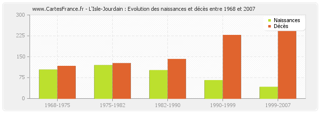 L'Isle-Jourdain : évolution des naissances et décès de 1968 à 2007