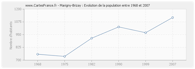 La population de Marigny-Brizay était de 1 118 habitants en 2007, 969 habitants en 1999, 1 026 habitants en 1990, 915 habitants en 1982, 737 habitants en 1975 et 758 habitants en 1968.
