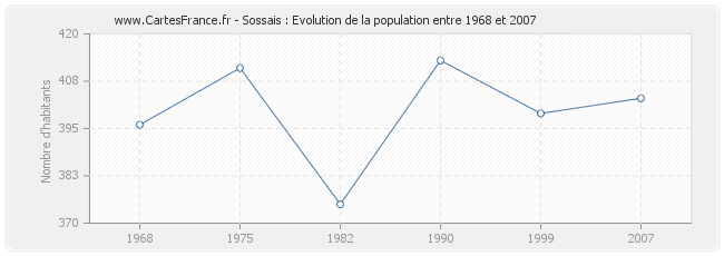 La population de Sossais était de 403 habitants en 2007, 399 habitants en 1999, 413 habitants en 1990, 375 habitants en 1982, 411 habitants en 1975 et 396 habitants en 1968.