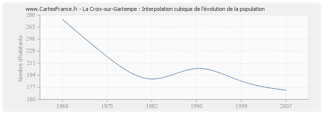 Cette courbe reprend l'historique de la population de La Croix-sur-Gartempe de 1968 à 2007 en interpolation cubique. Ceci permet d'obtenir plus précisément la population de la commune de La Croix-sur-Gartempe les années ou aucun recensement n'a été effectué.