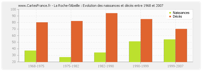 La Roche-l'Abeille : évolution des naissances et décès de 1968 à 2007