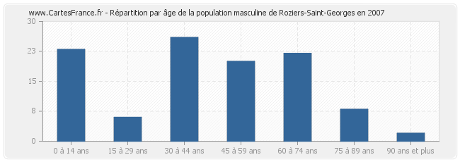 Répartition de la population masculine de Roziers-Saint-Georges par âge en 2007 :