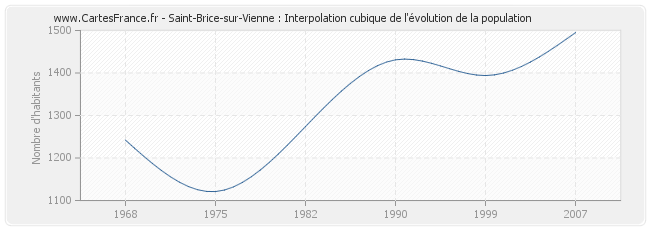 Cette courbe reprend l'historique de la population de Saint-Brice-sur-Vienne de 1968 à 2007 en interpolation cubique. Ceci permet d'obtenir plus précisément la population de la commune de Saint-Brice-sur-Vienne les années ou aucun recensement n'a été effectué.