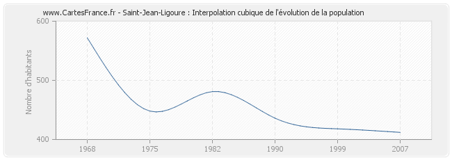 Cette courbe reprend l'historique de la population de Saint-Jean-Ligoure de 1968 à 2007 en interpolation cubique. Ceci permet d'obtenir plus précisément la population de la commune de Saint-Jean-Ligoure les années ou aucun recensement n'a été effectué.