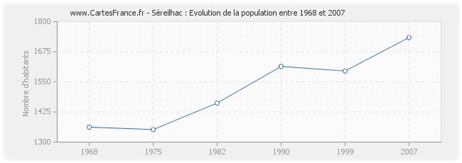 La population de Séreilhac était de 1 734 habitants en 2007, 1 595 habitants en 1999, 1 614 habitants en 1990, 1 462 habitants en 1982, 1 352 habitants en 1975 et 1 362 habitants en 1968.
