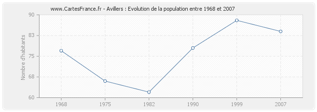 La population d'Avillers était de 84 habitants en 2007, 88 habitants en 1999, 78 habitants en 1990, 62 habitants en 1982, 66 habitants en 1975 et 77 habitants en 1968.