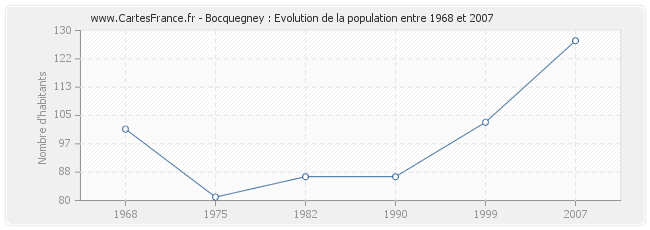 La population de Bocquegney était de 127 habitants en 2007, 103 habitants en 1999, 87 habitants en 1990, 87 habitants en 1982, 81 habitants en 1975 et 101 habitants en 1968.