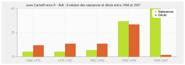 La population de Bult était de 294 habitants en 2007, 240 habitants en 1999, 203 habitants en 1990, 193 habitants en 1982, 204 habitants en 1975 et 227 habitants en 1968.