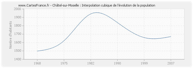 Cette courbe reprend l'historique de la population de Châtel-sur-Moselle de 1968 à 2007 en interpolation cubique. Ceci permet d'obtenir plus précisément la population de la commune de Châtel-sur-Moselle les années ou aucun recensement n'a été effectué.