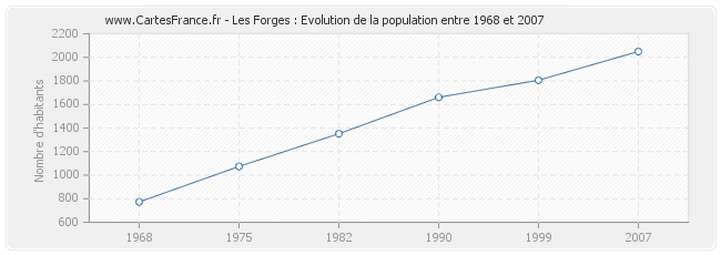 La population de Les Forges était de 2 050 habitants en 2007, 1 806 habitants en 1999, 1 661 habitants en 1990, 1 352 habitants en 1982, 1 074 habitants en 1975 et 773 habitants en 1968.