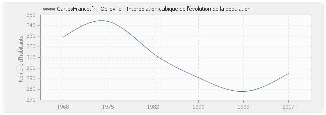 Cette courbe reprend l'historique de la population d'Oëlleville de 1968 à 2007 en interpolation cubique. Ceci permet d'obtenir plus précisément la population de la commune d'Oëlleville les années ou aucun recensement n'a été effectué.