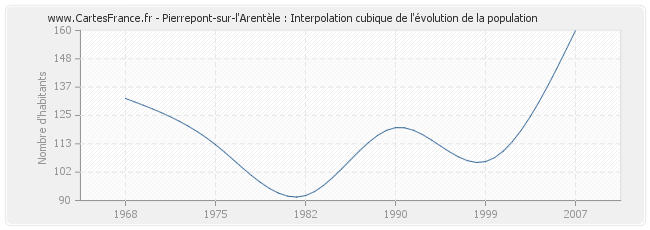 Cette courbe reprend l'historique de la population de Pierrepont-sur-l'Arentèle de 1968 à 2007 en interpolation cubique. Ceci permet d'obtenir plus précisément la population de la commune de Pierrepont-sur-l'Arentèle les années ou aucun recensement n'a été effectué.