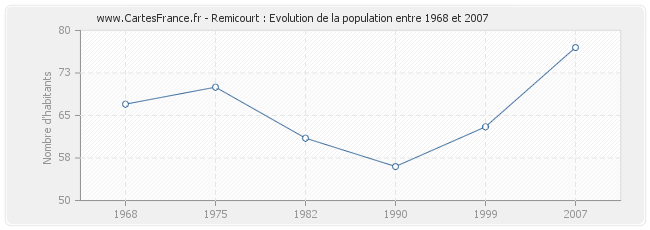 La population de Remicourt était de 77 habitants en 2007, 63 habitants en 1999, 56 habitants en 1990, 61 habitants en 1982, 70 habitants en 1975 et 67 habitants en 1968.
