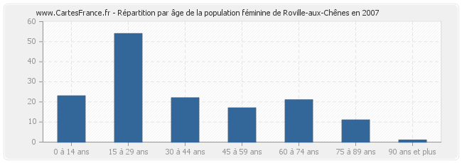 - Femmes de 15 à 29 ans habitant Roville-aux-Chênes : 54