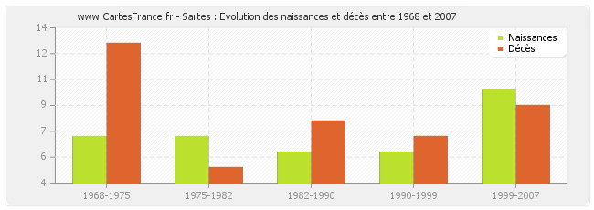 Sartes : évolution des naissances et décès de 1968 à 2007