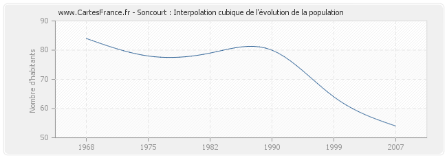 Cette courbe reprend l'historique de la population de Soncourt de 1968 à 2007 en interpolation cubique. Ceci permet d'obtenir plus précisément la population de la commune de Soncourt les années ou aucun recensement n'a été effectué.