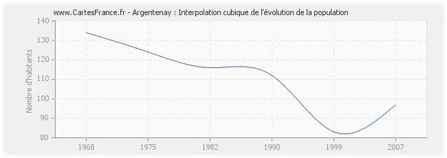 Cette courbe reprend l'historique de la population d'Argentenay de 1968 à 2007 en interpolation cubique. Ceci permet d'obtenir plus précisément la population de la commune d'Argentenay les années ou aucun recensement n'a été effectué.