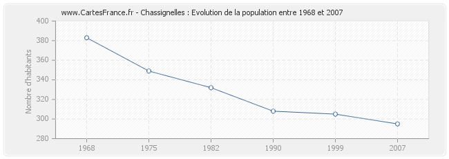 La population de Chassignelles était de 295 habitants en 2007, 305 habitants en 1999, 308 habitants en 1990, 332 habitants en 1982, 349 habitants en 1975 et 383 habitants en 1968.