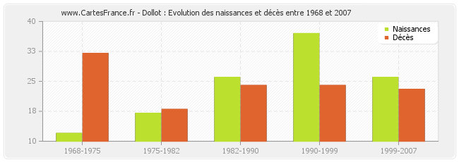 Dollot : évolution des naissances et décès de 1968 à 2007