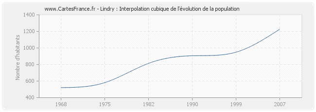 Cette courbe reprend l'historique de la population de Lindry de 1968 à 2007 en interpolation cubique. Ceci permet d'obtenir plus précisément la population de la commune de Lindry les années ou aucun recensement n'a été effectué.