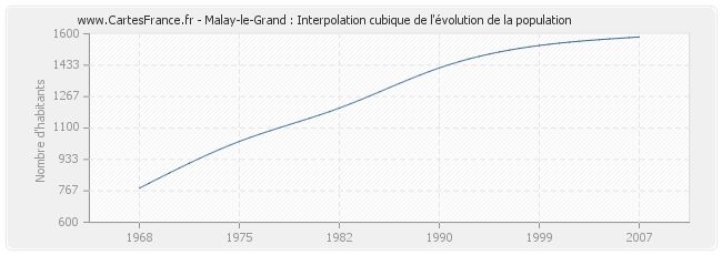 Cette courbe reprend l'historique de la population de Malay-le-Grand de 1968 à 2007 en interpolation cubique. Ceci permet d'obtenir plus précisément la population de la commune de Malay-le-Grand les années ou aucun recensement n'a été effectué.