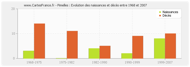 Pimelles : évolution des naissances et décès de 1968 à 2007