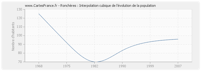 Cette courbe reprend l'historique de la population de Ronchères de 1968 à 2007 en interpolation cubique. Ceci permet d'obtenir plus précisément la population de la commune de Ronchères les années ou aucun recensement n'a été effectué.