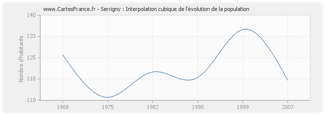 Cette courbe reprend l'historique de la population de Serrigny de 1968 à 2007 en interpolation cubique. Ceci permet d'obtenir plus précisément la population de la commune de Serrigny les années ou aucun recensement n'a été effectué.