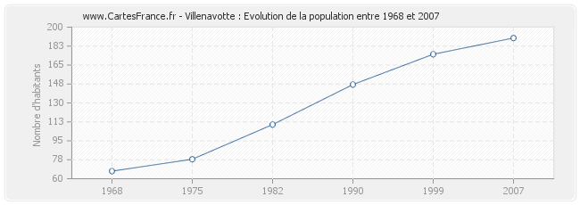 Cette courbe reprend l'historique de la population de Villenavotte de 1968 à 2007 en interpolation cubique. Ceci permet d'obtenir plus précisément la population de la commune de Villenavotte les années ou aucun recensement n'a été effectué.