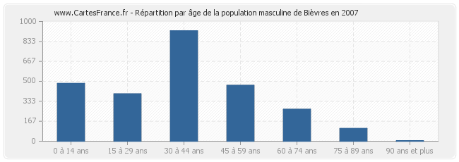 Répartition de la population masculine de Bièvres par âge en 2007 :