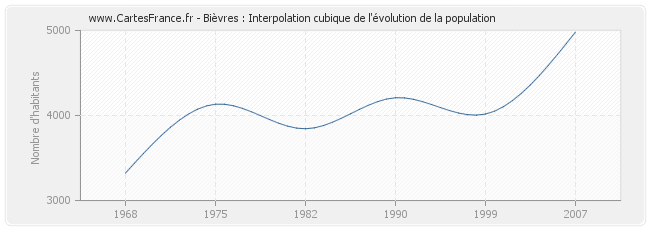 Cette courbe reprend l'historique de la population de Bièvres de 1968 à 2007 en interpolation cubique. Ceci permet d'obtenir plus précisément la population de la commune de Bièvres les années ou aucun recensement n'a été effectué.