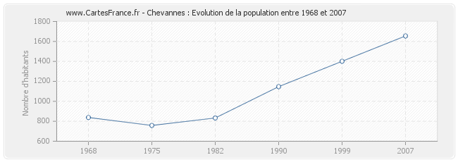 Cette courbe reprend l'historique de la population de Chevannes de 1968 à 2007 en interpolation cubique. Ceci permet d'obtenir plus précisément la population de la commune de Chevannes les années ou aucun recensement n'a été effectué.
