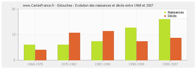 Estouches : évolution des naissances et décès de 1968 à 2007