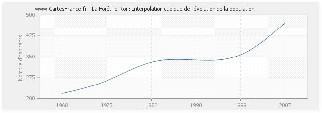 Cette courbe reprend l'historique de la population de La Forêt-le-Roi de 1968 à 2007 en interpolation cubique. Ceci permet d'obtenir plus précisément la population de la commune de La Forêt-le-Roi les années ou aucun recensement n'a été effectué.