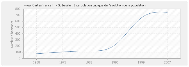 Cette courbe reprend l'historique de la population de Guibeville de 1968 à 2007 en interpolation cubique. Ceci permet d'obtenir plus précisément la population de la commune de Guibeville les années ou aucun recensement n'a été effectué.